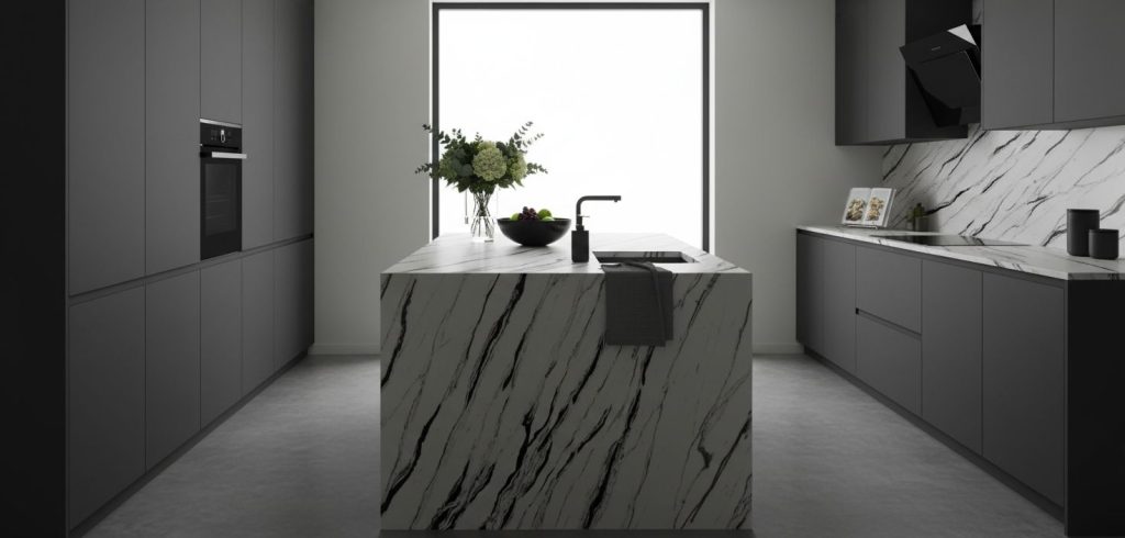 Straight Worktop, upstands & standard splashback plus sink & hob cut out. Includes laser template, delivery and installation