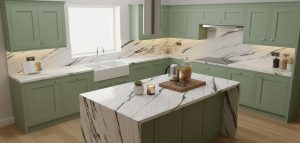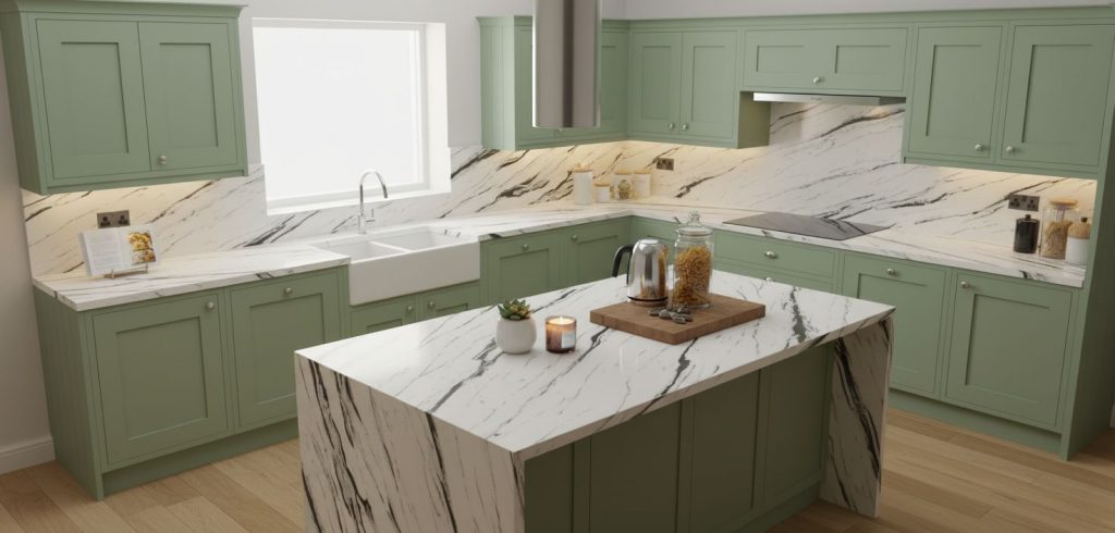 L-Shape Worktop PLUS Island, upstands & wide splashback plus sink & hob cut out. Includes laser template, delivery and installation