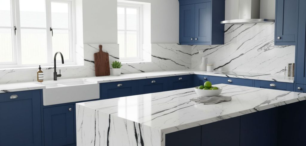 L-Shape Worktop, upstands & standard splashback plus sink & hob cut out. Includes laser template, delivery and installation