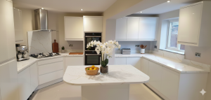U-Shape Worktop, upstands & wide splashback plus sink & hob cut out. Includes laser template, delivery and installation