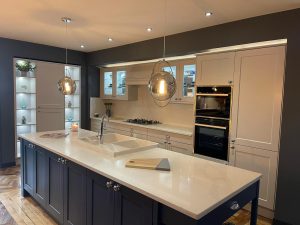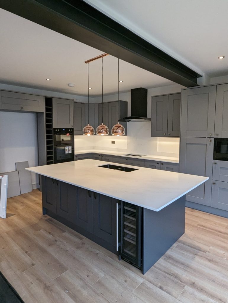 L-Shape Worktop PLUS Island, upstands & wide splashback plus sink & hob cut out. Includes laser template, delivery and installation