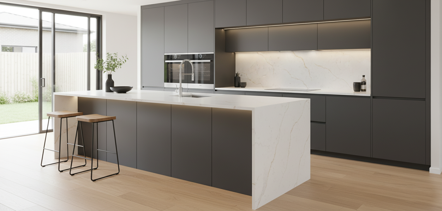 Straight Worktop, upstands & standard splashback plus sink & hob cut out. Includes laser template, delivery and installation