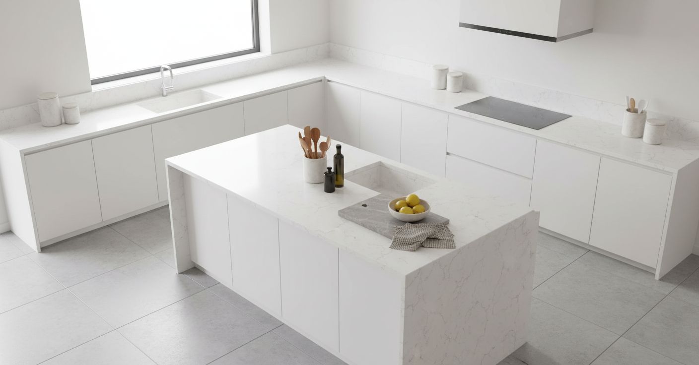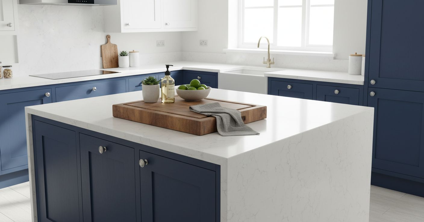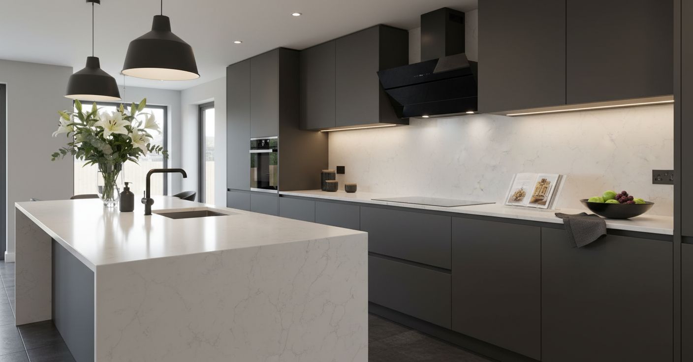 L-Shape Worktop, upstands & standard splashback plus sink & hob cut out. Includes laser template, delivery and installation